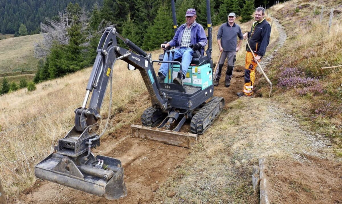 Seit Tagen nun sind die Ortsgruppen-Wegewarte Heinz Schemel und Siegfried Maier mit tatkräftiger Unterstützung von Bauhofmitarbeiter Andreas Baur und einem kleinen Bagger damit beschäftigt, den Weg wieder in einen guten Zustand zu versetzen.