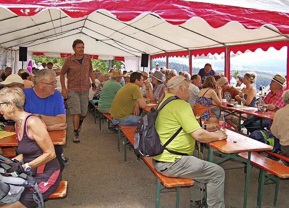 Rund 40 Mitglieder mehrerer Schwarzwaldverein-Ortsgruppen aus dem Bezirk Hochrhein, die größte aus Bad Säckingen, hatten sich an der sieben Kilometer langen Wanderung unter der Leitung von Bürgermeister Alexander Schönemann beteiligt. An der Hütte wurde dann gegessen und gefeiert, vor der Nase hatten die Wanderer den fantastischen Ausblick aufs Taubenmoos. Die Nähe zu Todtmoos brachte es mit sich, dass auch Wanderer aus der Nachbargemeinde am Jubiläum teilnahmen.