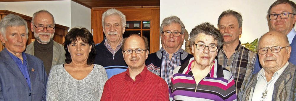 Diese Mitglieder wurden mit Nadeln und Urkunden ausgezeichnet: Ernst Thoma, Edwin Baur, Edmund Schmidt, Ernst Spiegelhalter, Hildegard Kaiser, Fritz Baur, Manfred Franz (neu im Vorstand), Peter Schlachter (von links). Foto: Franz KaiserDreierteam an der Spitze des Schwarzwaldvereins