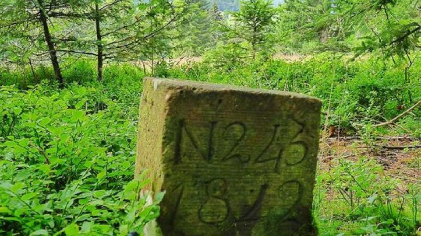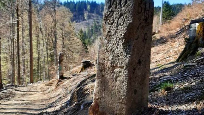 Weiter ging es bergan. Die Gruppe passierte einen verwitterten Gemarkungsstein aus dem Jahr 1842, der die Grenze zwischen den damals eigenständigen Gemeinden Dorf und Hof markiert. Der Pfad führt auch an Stellen vorbei, an denen sich im Winter Lawinen den Weg talwärts bahnen, was aber immer seltener der Fall sei, so Peter Lutz.