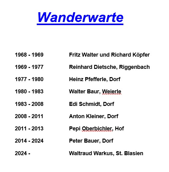 Unter den Wanderführern Fritz Walter, Reinhard Dietsche, Fritz Wasmer und Leo Köpfer (Riggenbach) wurden ab 1966 viele Wanderungen durchgeführt, die einen sehr großen Zuspruch fanden.